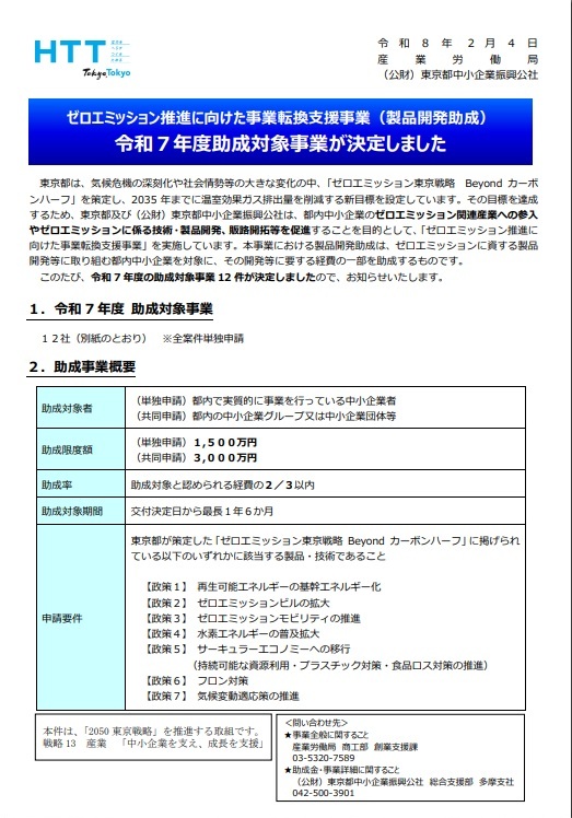 令和7年度ゼロエミッション推進に向けた事業転換支援事業(製品開発助成) 助成事業に採択されました。 2026 2/19 当社が推進ンを計画している「FCV 組立水素供給フランチャイズシステムの開発」が令和7年度ゼロエミッション推進に向けた事業転換支援事業(製品開発助成) 助成事業に採択されました。 News URLをコピーしました! 「FCV発表会in下北沢」 のご案内 コメント コメントする コメントをキャンセルコメント ※ 名前 ※ メール ※ サイト 次回のコメントで使用するためブラウザーに自分の名前、メールアドレス、サイトを保存する。